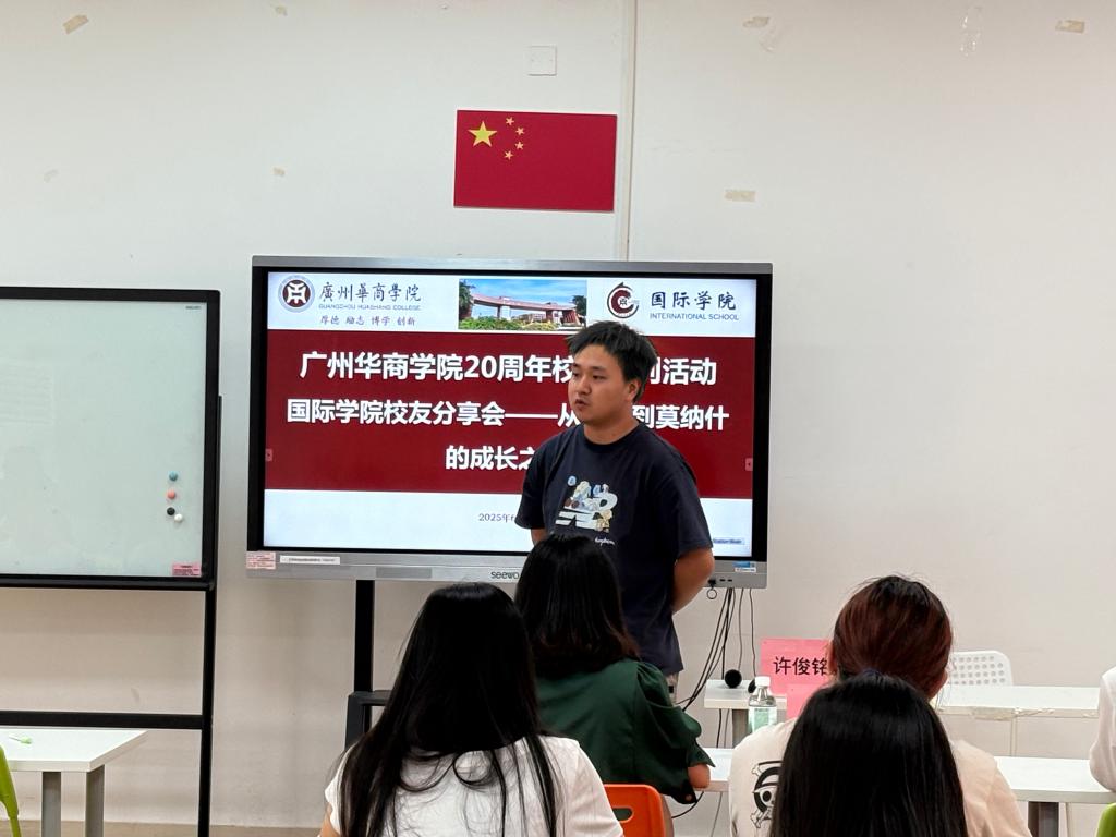 为增进校友与母校的联系,促进校友与在校生互动交流,搭建沟通平台,推动经验分享与资源整合,助力学生成长与发展。6月3日(周二)下午15:00,广州华商学院国际学院在启智楼412顺利举办“从华商到莫纳什的成长之旅”校友分享会。分享会邀请了2017级英语国际班校友许俊铭担任主讲嘉宾,他结合本科在英国哈德斯菲尔德大学、研究生在澳大利亚莫纳什大学的求学经历,为同学们带来了一场内容丰富、实用性强的经验分享。本次分享会吸引了国际学院、创意与设计学院、健康医学院、教师教育学院、文学院等院系的学子积极参与,由国际学院学工办主任关慧慧主持。