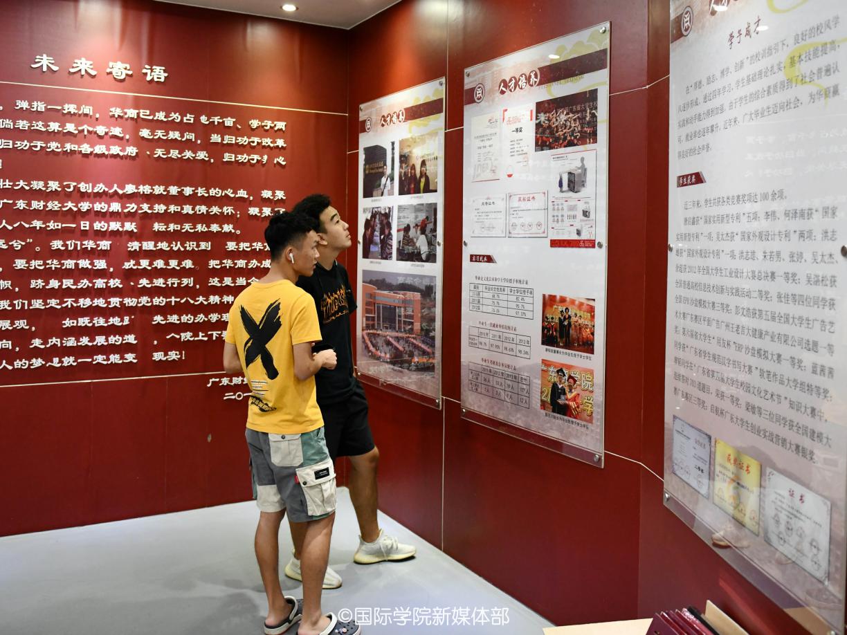 同学们在启智楼集合签到后,便前往行政楼一楼参观校史馆。首先映入眼帘的是广东财经大学华商学院的校训:博学、创新、厚德、励志。随着一路参观,同学们了解了学校发展历程以及“创百年名校,育华夏英才”的办学理念。紧接着18级学姐向大家分别介绍了学校领导班子成员、学校科学研究成果及学科专业建设,并且着重介绍了学校的教学管理、师资力量、学术交流和党团建设等人才培养机制。最后学姐向大家讲述了校史馆内陈列的各类证书和奖杯的由来,以及往届优秀华商学子的事迹。