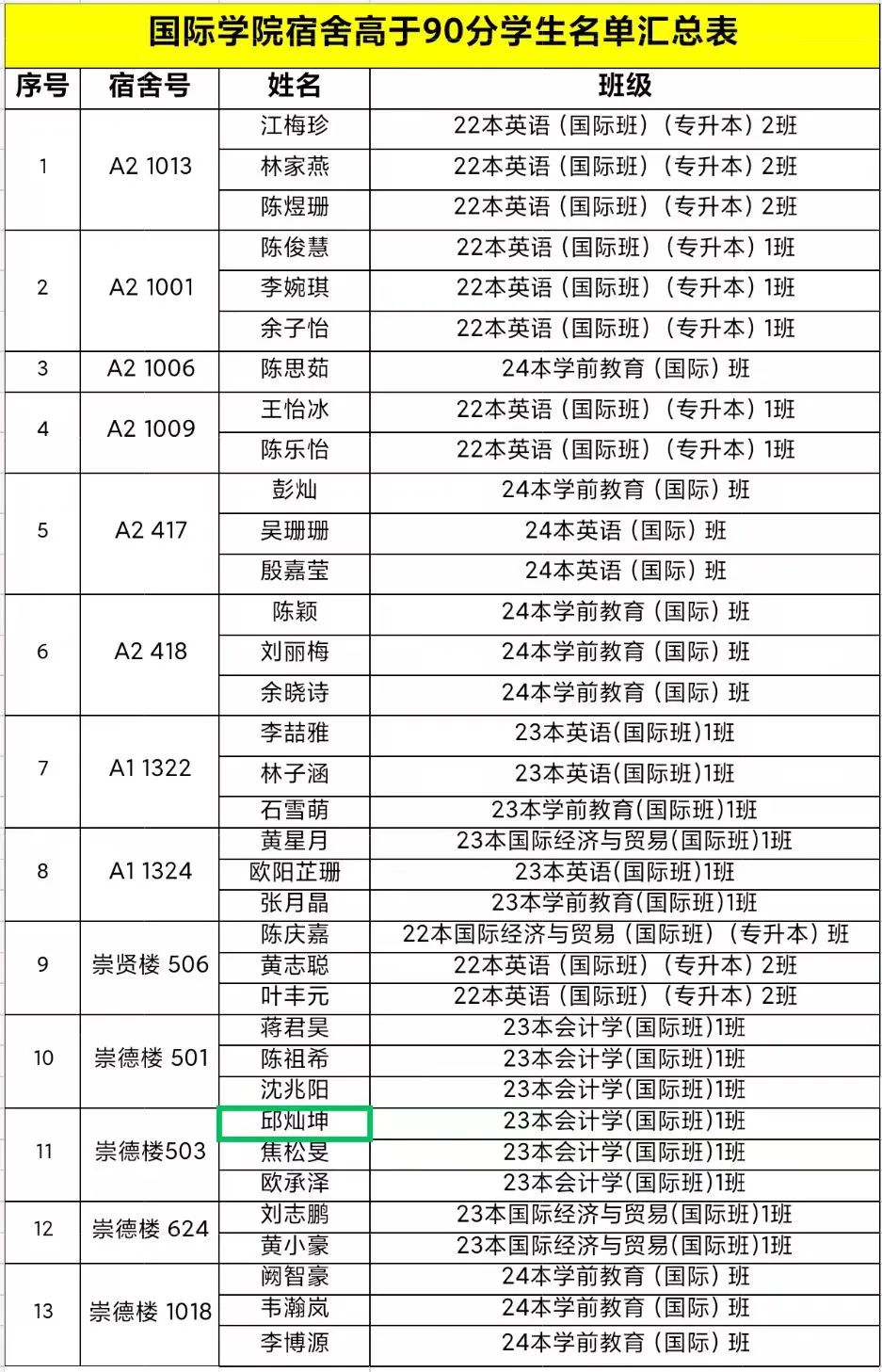 安全与卫生是校园生活的基石,更是每一位同学健康成长的保障。通过师生们的配合协作,本次宿舍大检查活动共有13间宿舍综合评分高于90分,这些宿舍将给与“整洁宿舍”称号,同时宿舍所有成员将获得1分劳育分奖励。获评宿舍公示如下: