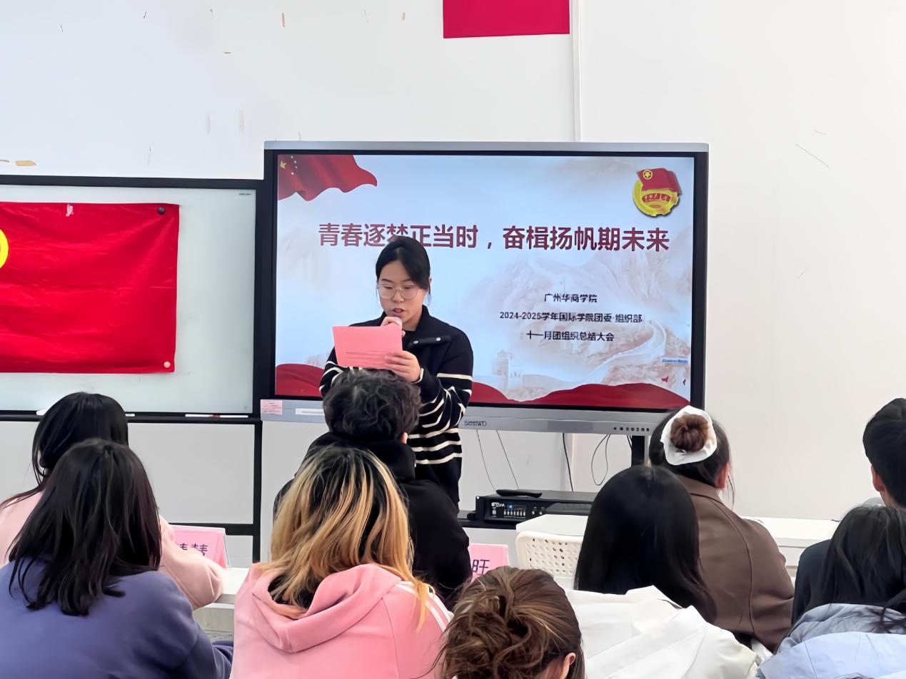 会议尾声,团委书记郝自秀老师对此次团生活动进行了总结。首先,她对同学们在本月团生活动中展现出的积极主动与热情参予以肯定,强调这些活动经历不仅是个人成长的宝贵财富,更是团组织凝聚力与向心力的生动体现。其次,郝自秀老师对团员们提出了新的要求与期望,鼓励大家继续保持积极向上的学习状态,集思广益,共同打造形式新颖、内容贴近生活、主题契合时代发展的团生活动,不断丰富国际学院团组织生活。最后,她对学院团委组织部全体工作人员表示感谢,希望工作人员日后再接再厉,携手为团员青年们提供思想政治学习与交流的平台,助力同学们全面发展。