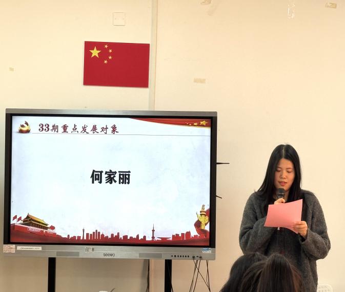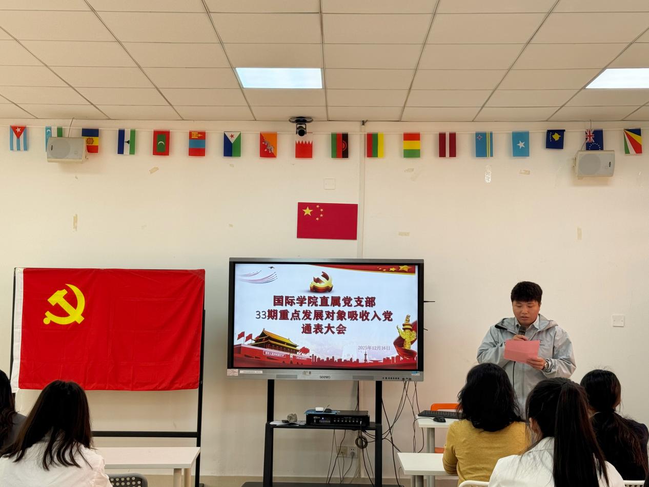 为进一步加强基层党组织建设,发展壮大学生党员队伍,切实提高党员发展质量,保持党员队伍先进性和纯洁性,按照党员发展细则和发展程序要求,国际学院直属党支部于2025年12月16日下午在启智楼412召开33期发展对象吸收入党通表大会。本次大会由国际学院直属党支部组织员吴锦涛主持,出席本次大会的人员有:国际学院直属党支部书记回雁雁、宣传委员郝自秀以及支部全体党员、预备党员、发展对象及部分入党积极分子参加会议。