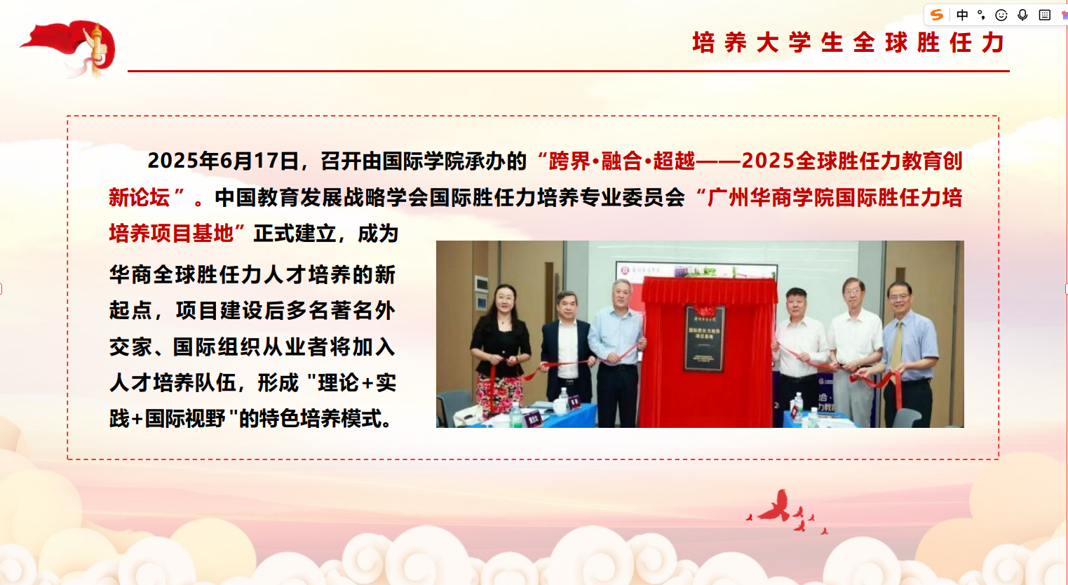 面向未来,回雁雁书记指出,在国际交流与合作、国际组织人才、文化交流人才等方面存在紧缺,亟需新时代青年主动担当。她介绍了国际学院为学生搭建的多元平台,如参加中国联合国协会主办的模拟联合国、国际公务员能力建设培训项目,以及建立“广州华商学院国际胜任力培养项目基地”等。她勉励全体学生党员和干部,主动把握学习机遇,深耕专业知识,积极参与国际交流实践,全面提升国际视野、跨文化沟通能力与全球胜任力,努力成长为既有深厚家国情怀,又有宽广国际视野和过硬专业素养的新时代国际化青年。
