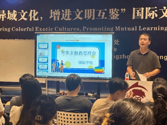国际学院于2023年9月13日晚上6点30分在启智楼501召开了20、21、22级学生班会。本次主题教育班会直属党支部书记、辅导员杨李军老师围绕成绩分析、专业学习、综测评优、安全教育、学生活动以及其他问题展开讲述。