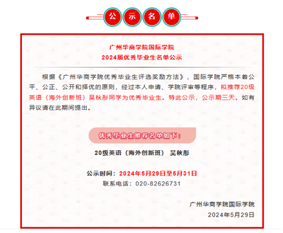 公示 | 广州华商学院国际学院2024年优秀毕业生名单公示