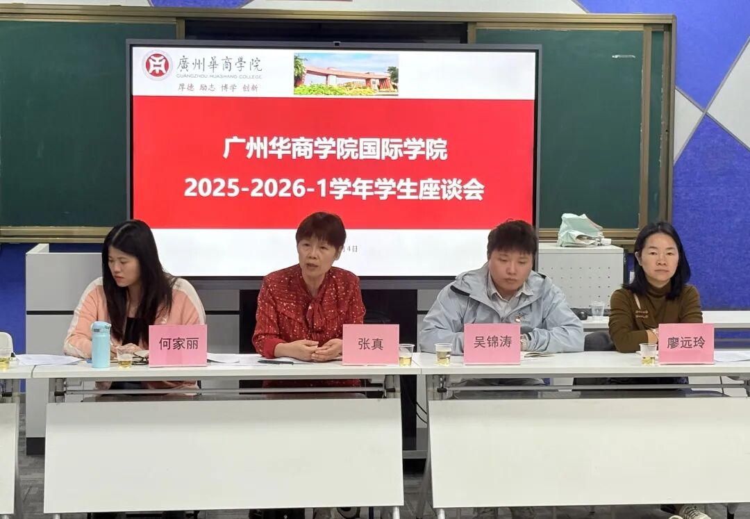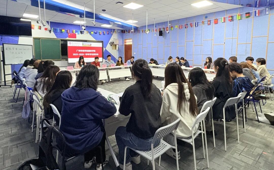 11月4日中午,国际学院副院长张真、学工负责人吴锦涛、教学秘书何家丽、教学助理冯乐欣、辅导员廖远玲、张清影以及国际学院29位班级代表在启智楼401召开2025-2026学年学生座谈会。