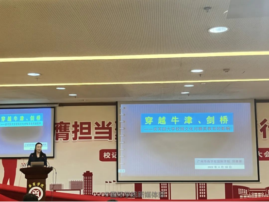 为从国际化视角解读“创百年名校 育华夏英才”的办学理念,让华商学子深入了解高校历史文化对培养为人类社会做出巨大贡献精英们的影响,探秘世界领先高校牛津、剑桥大学的办学历史、文化、理念,使同学们能够具备国际视野,更加关注校园文化在个人成长中发挥的关键作用。广州华商学院国际学院联合校图书馆于2023年4月18日14:30,举办了主题为“穿越牛津、剑桥——谈英国大学校园文化对精英教育的影响”讲座。讲座由华商国际学院回雁雁院长担任主讲,学校图书馆温万虎馆长主持。国际学院、图书馆的老师及200多名大学生现场聆听了讲座。