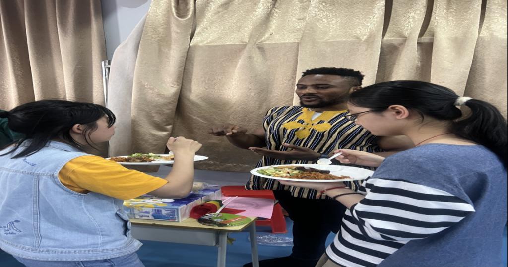开幕式后,举办了加纳历史文化分享会,加纳籍外教Frank Larbi通过介绍加纳历史、文化、风俗、特产、教育、艺术,让在场的观众享受了一场文化盛宴,期间还穿插了歌舞表演、加纳特产有奖问答、非洲鼓打击技巧、学跳非洲舞蹈等内容,整场互动欢快、热烈,笑声欢呼声此起彼伏。最后,与会人员还品尝了加纳传统美食和饮品。