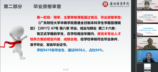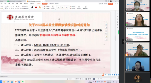 沈晓婷老师在汇报毕业生毕业工作进程时,也提醒了同学们要在“广州华商学院教务处”公众号上及时确认核对自己的课程修读状况,如发现有误应在备注栏详细说明并按时提交。