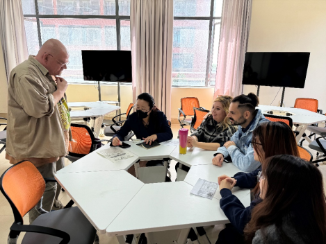 六、观摩优秀教师授课,提升团队对提高英语能力认识。国际学院组织教师和团队成员到肇庆校区聆听美国籍教师John Jung的英语口语课,并在课间与该教师再次深入交流如何培养大学生学习英语的兴趣和鼓励他们开口说英语。