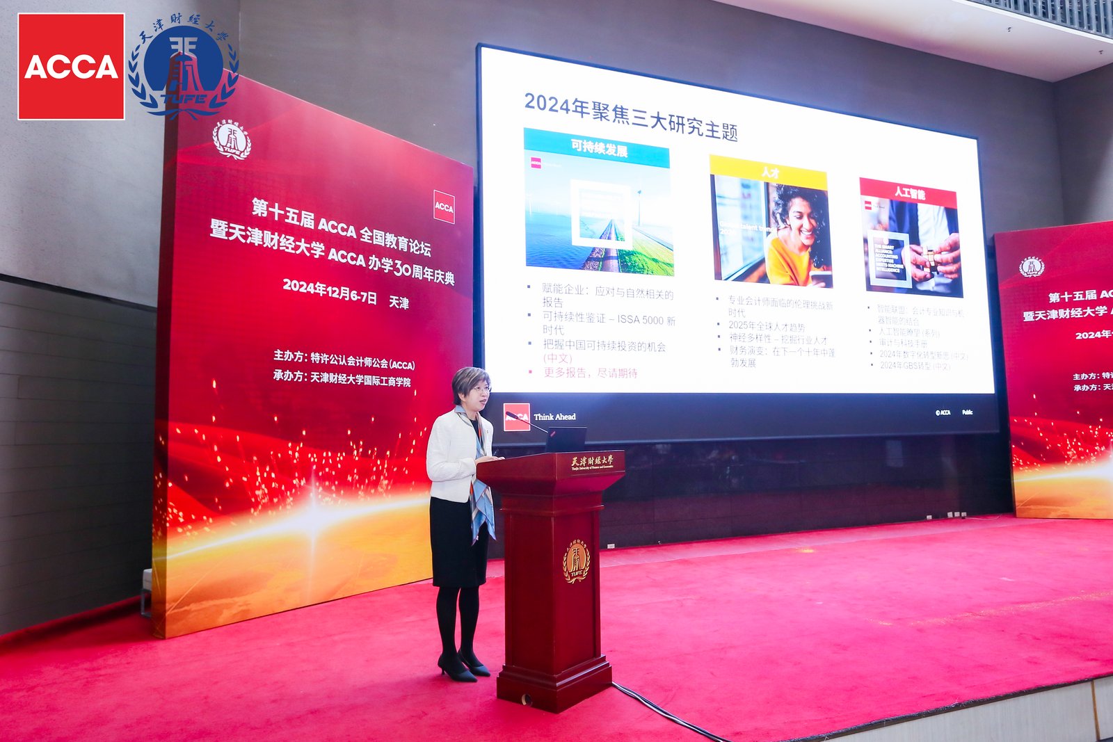 为了推升国际学院ACCA国际注册会计师班的教学水平,学习兄弟学校在领域的教学和研究成果,2024年12月6-7日,国际学院回雁雁院长、ACCA专员姚晓敏、国际项目助理黄俊辉参加了由特许公认会计师公会(ACCA)主办、天津财经大学国际工商学院承办的“第十五届ACCA全国教育论坛暨天津财经大学 ACCA 办学 30 周年庆典” 。此次论坛以 “可持续发展重塑职场未来”为主题,特邀全国众多高校代表、行业组织及知名企业领军人物参与,共同探讨财会教育的创新发展之路,探讨会计教育领域最新趋势和挑战,交流助力ACCA 学员进阶并提升就业竞争力的创新举措。