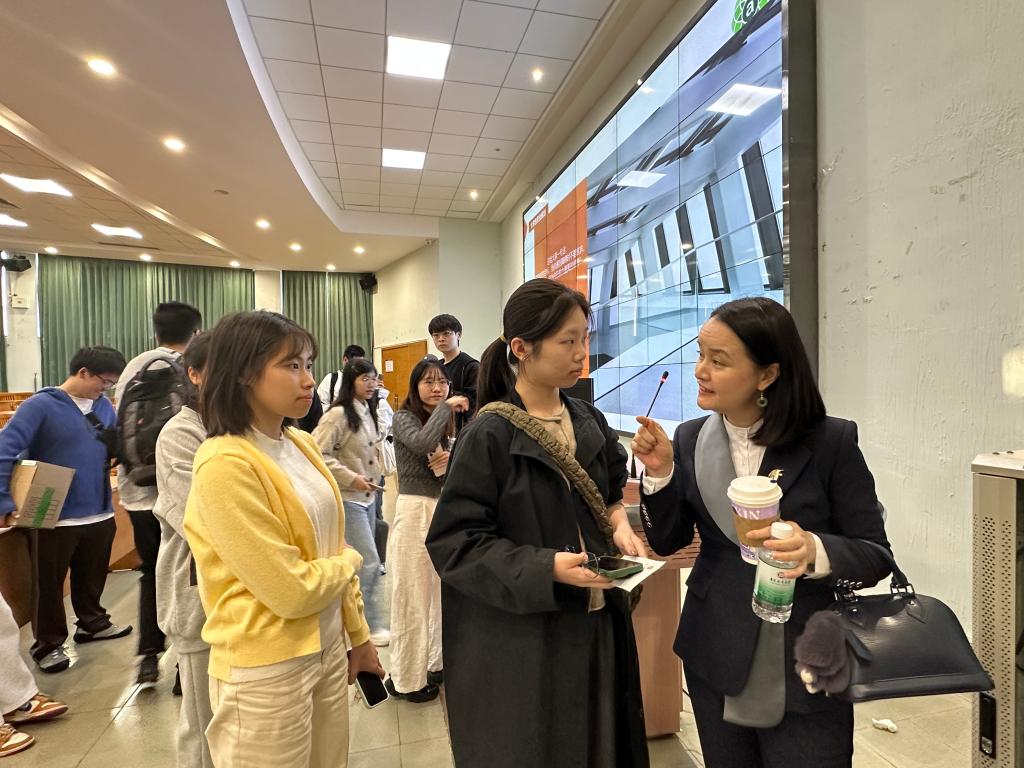 回雁雁院长为邹女士颁发了聘书,她表示邹女士以丰富的职场经验和深厚的专业知识,从就业环境分析、如何规划职业生涯以及如何制作吸引HR的简历几个方面做了详细地阐述。她强调,学子们在分析自身优势时,也不要忽略学校给大家提供的机会,如选拔优秀学子到新加坡参加英语集训等,希望同学们能够充分利用大学四年以及学校给大家搭建的平台,夯实专业基础、提高英语水平、增强跨文化交流能力,为未来就业打下坚实基础。