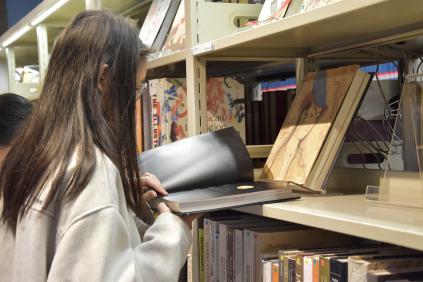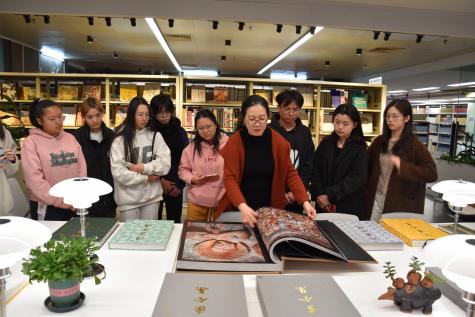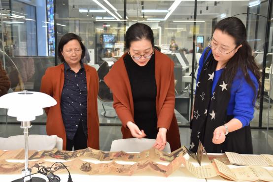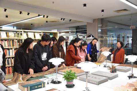 讲座结束后,广州美术学院图书馆馆长刘淑贤教授带领师生们参观了馆内的珍贵文献及特色设施,包括云岗石窟珍藏卷轴的精美拓印、传世佳作《清明上河图》、李公麟的名作《五马图》、韩滉的《五牛图》等经典文献。看到师生对这些珍贵文献充满好奇和欣赏之情,刘淑贤馆长热情邀请同学们来参观广州美术学院美术馆,有更多机会接受艺术的熏陶。