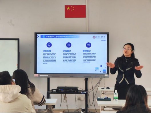 回雁雁院长首先介绍了合格评估的背景和意义。她向与会人员指出,本次合格评估是国家对高等教育质量保障体系的一部分,评估工作的重要性不言而喻。作为提升学校教学质量与促进教学改革的重要手段,合格评估将对学校的长远发展有着深远影响,因此,每一位教职工都应高度重视。通过此次解读会议,国际学院与国际交流合作处全体教职工将明确评估的目标与任务,充分了解本科合格评估的指导思想以及核心内容,为评估工作做好充分准备。