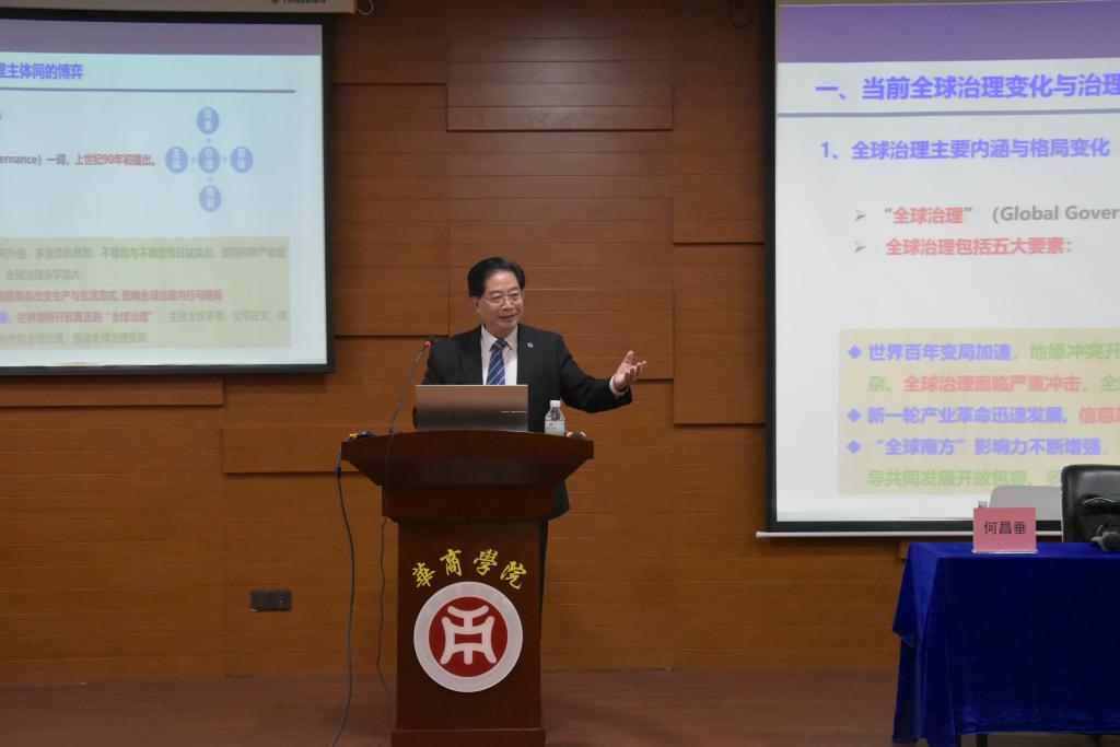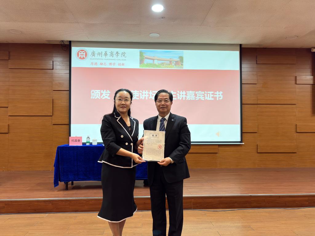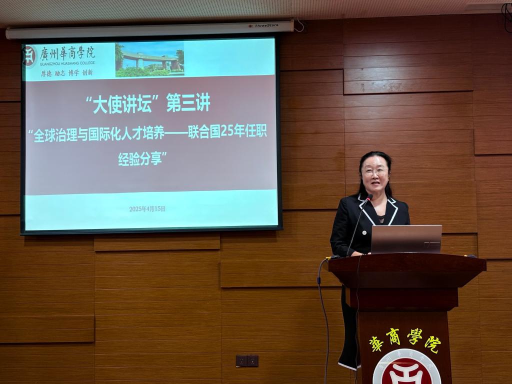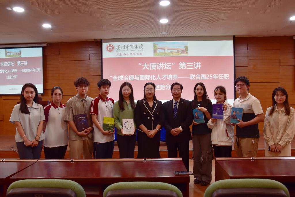为培养具有国际视野和全球竞争力的青年才俊,为国际组织和参与全球治理做好人才储备,广州华商学院“大使讲坛”第三讲于2025年4月15日在中央图书馆报告厅举行,本期主讲嘉宾是在联合国任职超过25年的联合国粮农组织原副总干事(联合国副秘书长级别)、国际欧亚科学院何昌垂院士,国际学院回雁雁院长、行政助理黄俊辉、ACCA专员姚晓敏、学工助理冯乐欣、兼职辅导员许育珠,以及来自国际学院、文学院、教师教育学院、健康医学院、人工智能学院、传播与传媒学院、数字经贸学院、会计学院、管理学院的200多名同学现场聆听,共同开启这场探索全球治理与国际化人才培养的学习之旅。国际学院回雁雁院长主持了本场讲坛。