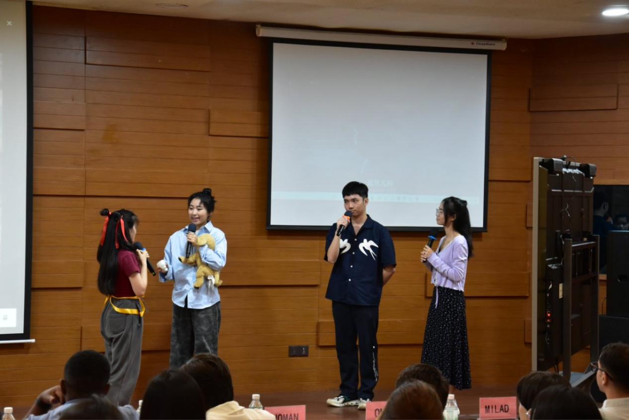 来自外国语学院的"Spark"团队凭借纯正的英式发音和富有感染力的表演,将哪吒"我命由我不由天"的经典台词诠释得淋漓尽致;国际学院的"Cosmic Voices"组合则通过默契的配合和生动的肢体语言,完美再现了哪吒与敖丙的精彩对戏。选手们不仅展现了扎实的英语功底,更通过创新的艺术表达,让这一传统神话人物焕发出新的时代光彩。现场中外师生完全沉浸在精彩的表演中,每当选手完成配音,观众席都会爆发出热烈的掌声。