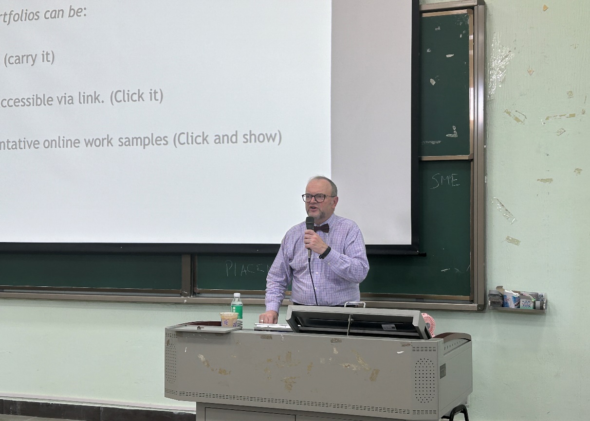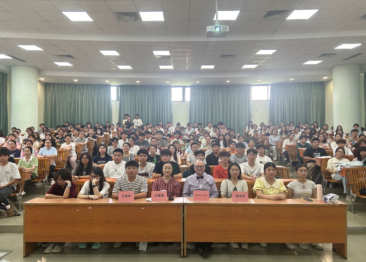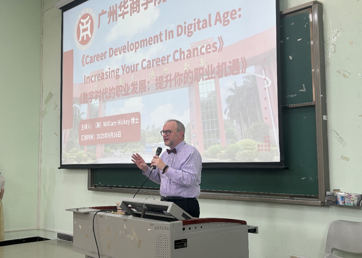 随着人工智能时代的到来,各行各业正面临深刻变革与全新挑战。为帮助大学生在校期间即具备应对未来挑战的能力与素养,引导其从全球视野思考职业发展方向并科学规划学业与职业生涯,国际学院在2025级新生入学教育系列讲座中,特别增设了由美国籍专家主讲的内容。2025年9月16日,(美)William Hickey博士应邀开展了题为“数字时代的职业发展:提升你的职业机遇”(CareerDevelopment in Digital Age: Increasing Your Career Chances)的专题讲座。广州华商学院国际学院院长回雁雁、学生工作负责人吴锦涛、辅导员廖远玲,以及国际学院全体新生,与来自健康医学院、会计学院、文学院、人工智能学院的328名学生共同聆听了本次讲座。