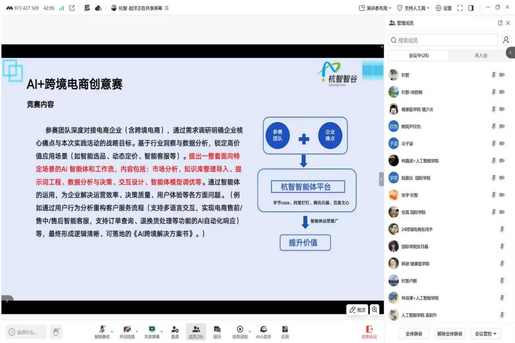 在10月7日提交的“AI跨境解决方案书”环节中,同学们积极对接企业真实需求,围绕物流效率、客户服务、精准营销等核心场景,提出了多项具有落地潜力的AI解决方案。赛前,国际学院组织了线上答疑会,企业导师就同学们关心的问题进行了针对性指导。10月11日,五支优秀团队晋级线下路演,通过PPT讲解与AI智能体演示,全面呈现了技术与商业的融合创新。