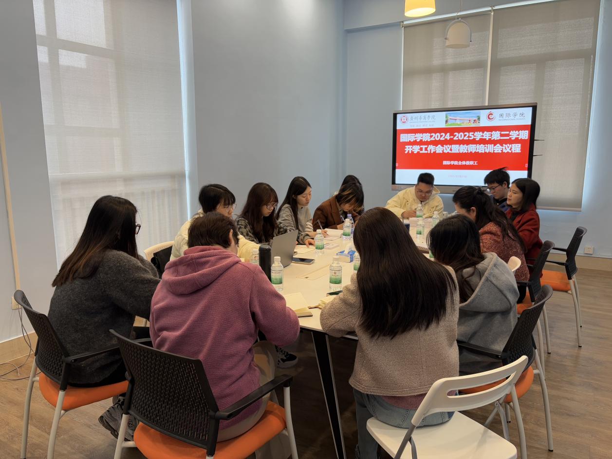 回雁雁院长传达了学校高质量发展大会精神,并结合学校领导在大会上的讲话,根据学校重点工作和发展规划对本学期的工作提出了具体要求:一是强调了大局观念和长期精神,学校未来发展的三大目标是本科教学合格评估、硕士点申报、建成广州华商大学,这需要每位教职工长期坚持努力;二是学校目前面临最紧迫的任务就是迎接本科教学合格评估,按照董事会的要求,要一次性通过,每位老师和每个岗位都要严格按照本科合格评估标准做好工作,不能出差错;三是在师资队伍建设方面,国际学院要重点提升青年教师的教学能力和培训,2位今年7-8月工作满一年的教师将于暑假期间赴澳大利亚进行为期12天的ELICOS教学法培训;四是提高服务和管理水平,国际学院各个岗位都要做好服务,并在工作中不断学习和了解政策,做到依法治院,在掌握政策的基础上做好服务和管理;五是国际学院的工作要持之以恒地在特色上下功夫,今年要继续做好已有的特色项目,形成成果积累,同时开发新的特色项目,如大使讲坛、《哪吒2》英语配音比赛等;六是加强与企业的合作,启动企业导师制度;七是推进大学生竞赛,积极备战“挑战杯”全国大学生课外学术科技作品竞赛,并筹备英语类竞赛;八是做好迎接20周年校庆的工作,积极联系校友,做好国际学院宣传册和宣传片;九是深入推进招生宣传工作,要将招生工作向前端推进,深入到目标中学宣讲,扩大学校的影响力;十是加强支部建设,真正有实效地开展组织生活,让思政教育入脑入心。