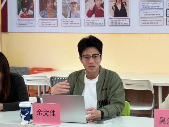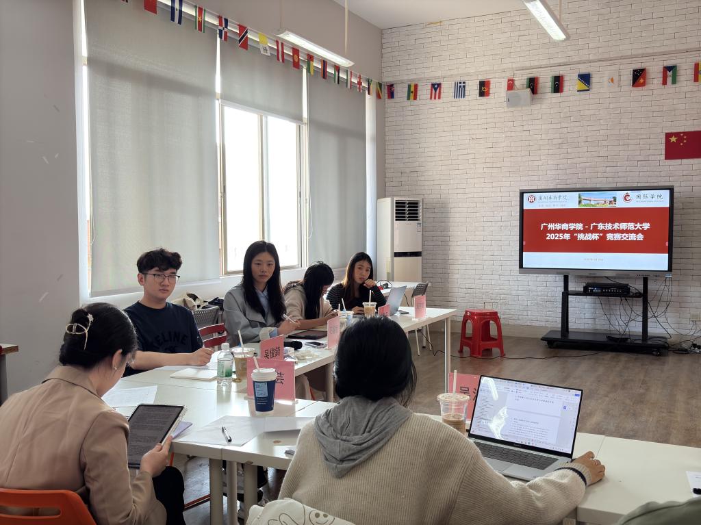 学工办主任关慧慧首先对广东技术师范大学四位同学的到访表示热烈欢迎。她指出,这几位同学作为"挑战杯"竞赛的参赛团队成员,已积累丰富的实战经验,相信通过他们的经验分享和悉心指导,国际学院的学生们不仅能够更清晰地把握任务分工,加深对赛事的理解,更能有效完善项目策划书,为即将到来的比赛做好充分准备。