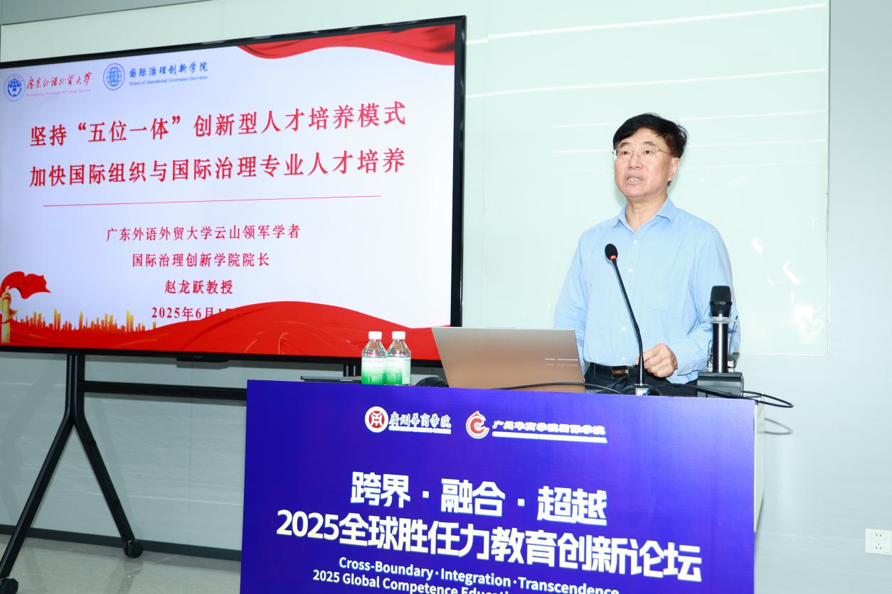 论坛上,广东外语外贸大学国际治理创新学院院长赵龙跃教授从国家战略高度系统解读了新时代党和国家对全球胜任力人才培养的政策要求,深刻阐述了高校在服务国家发展战略中的使命担当,重点介绍了广外构建的“五位一体”人才培养模式,并以详实的数据和典型案例展示了该模式取得的显著成效——近年来已培养输送数十名优秀毕业生赴联合国等国际组织任职,为我国参与全球治理提供了重要人才支撑。