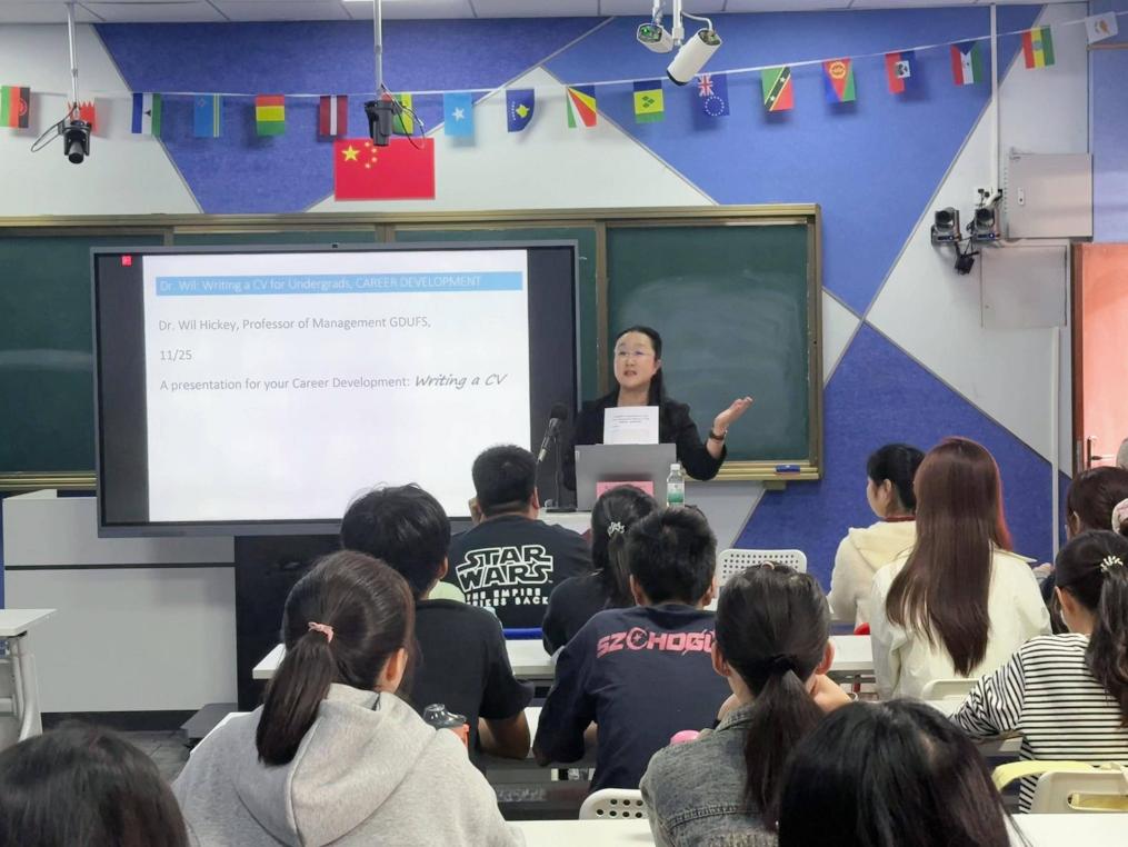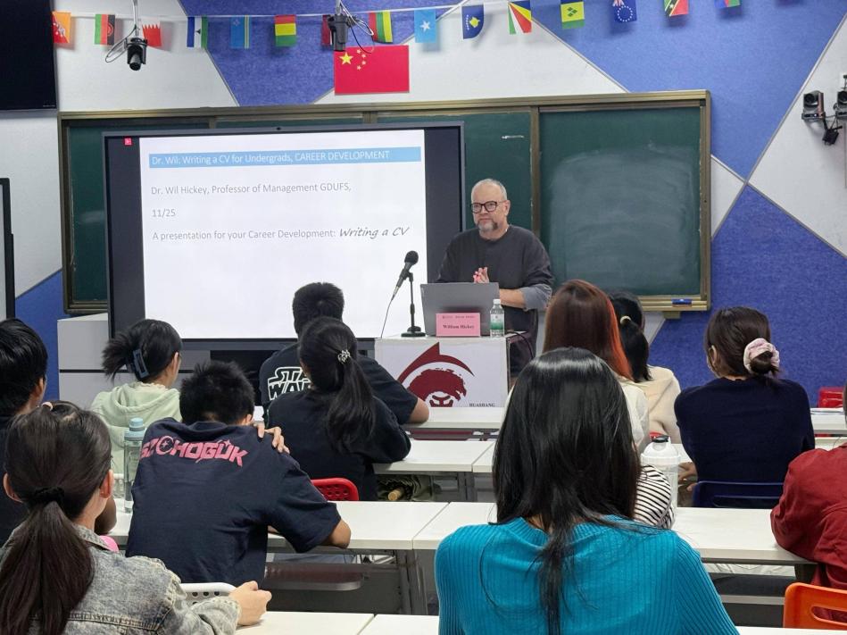为助力2026届毕业生深入了解国际企业的岗位需求与求职路径,2025年11月25日,国际学院特邀广东外语外贸大学教授、AACSB认证顾问William Hickey博士担任主讲人,开展了题为“职业发展讲座:如何撰写简历(A Presentation for Your Career Development)”的专题活动。William Hickey博士拥有宾夕法尼亚州立大学人力资源开发博士学位,曾两度荣获美国富布赖特教授奖,在人力资源开发、国际商务、能源政策及组织行为等领域具备超过二十年的实践经验,并在亚洲及东盟地区积累了深厚的学术与实践背景。讲座中,他结合个人成长与求职经历,为来自国际学院、文学院、人工智能学院、教师教育学院及健康医学院的五十余名师生系统解析了外资企业的求职路径与简历撰写专业要点。本次讲座由国际学院回雁雁院长主持。