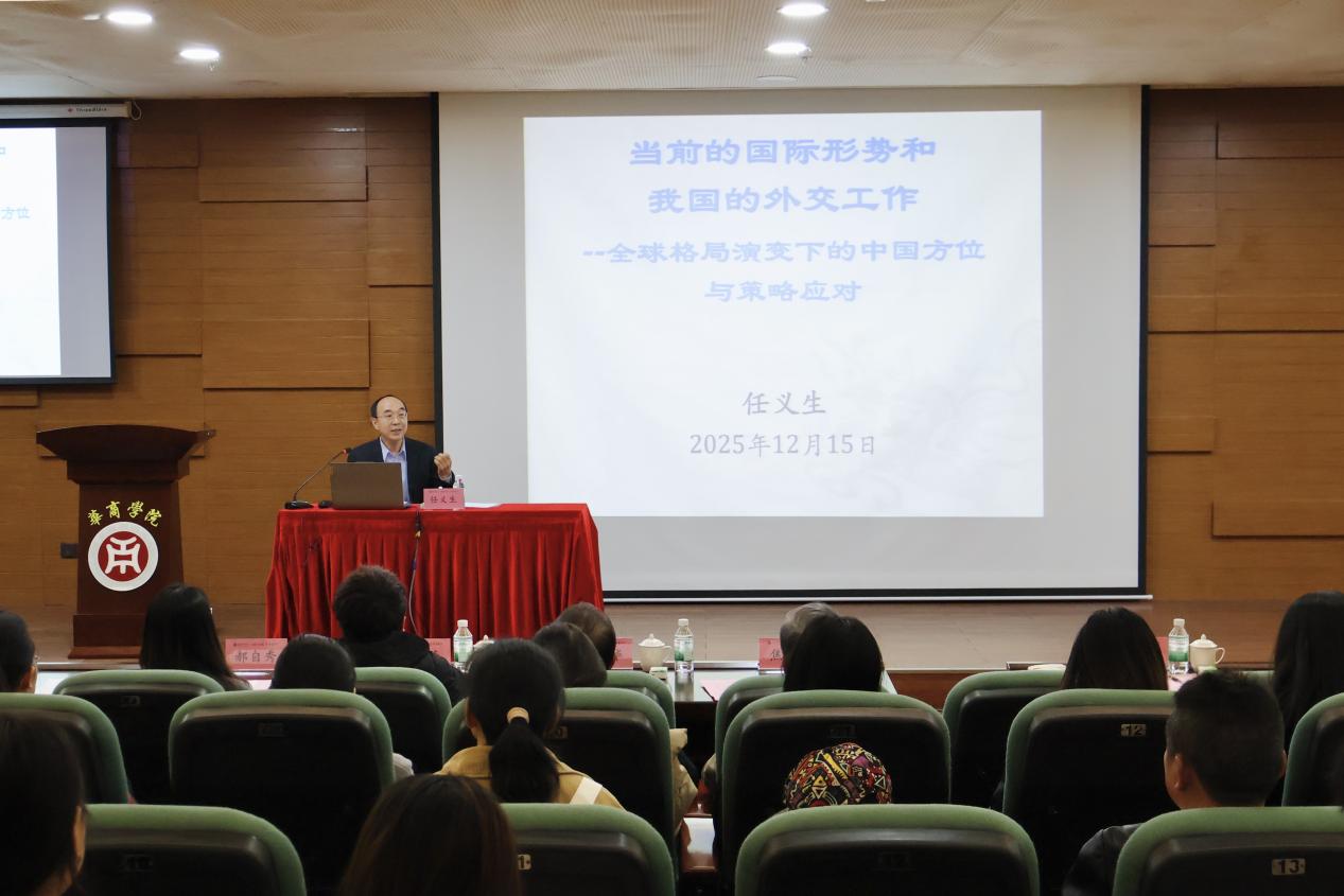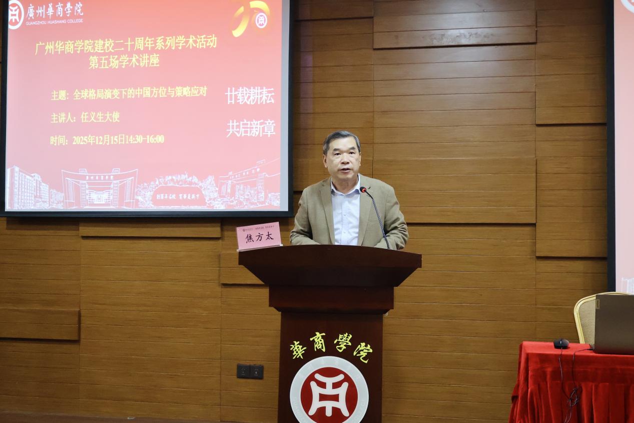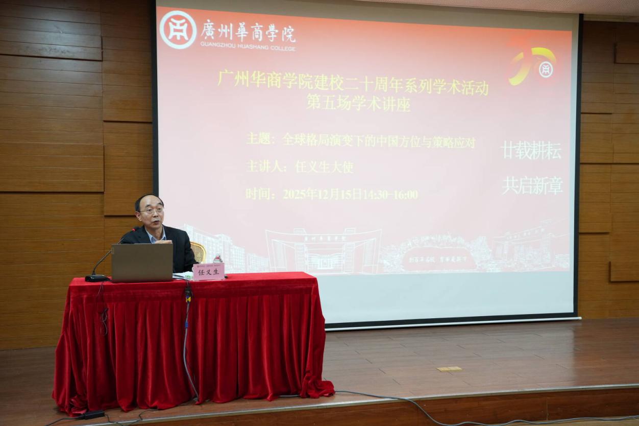 为迎接建校二十周年华诞,进一步营造学术氛围、拓展师生国际视野,2025年12月15日,广州华商学院特邀联合国人权理事会咨询委员会委员、前中国常驻联合国代表团参赞、常驻日内瓦代表团公使衔参赞、驻清迈总领事、驻利比里亚大使任义生先生莅校作专题报告。报告以“全球格局演变下的中国方位与策略应对”为主题,由焦方太副校长主持。校友会会长郭银华教授、国际学院回雁雁院长,以及健康医学院、国际学院、教师教育学院等院系二百余名师生共同聆听了本次报告。