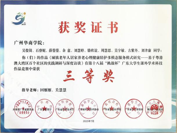 国际学生参赛团队凭借《城镇老年人居家养老心理健康陪护多模态服务模式研究——基于粤港澳大湾区百个社区的实践调研与深度访谈》荣获第十八届“挑战杯”广东大学生课外学术科技作品竞赛省级三等奖。