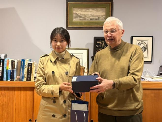 在斯特拉斯堡大学(University of Strasbourg),诺贝尔化学奖得主让-马里·莱恩教授为到访的学子们举办了一场题为《从简单到复杂》的学术讲座。他深入浅出地阐释了生命起源与演化的前沿科学问题,其深邃的洞见与生动的讲述,不啻为一场学术盛宴。在座谈环节,同学们围绕学术研究、文化交流、青年成长等话题,与教授进行深入对话。莱恩教授畅谈中西方文化差异与共通之处,并结合自身科研经历,谆谆寄语青年学子:永葆学术热忱与探索精神,勇于开拓未知的科学疆界。同学们分享了个人梦想与未来规划,并向教授赠送精心准备的富有中华文化特色的小礼物。这段交流时光,让同学们感受到顶尖科学家的亲和力,也收获了满满的鼓励。