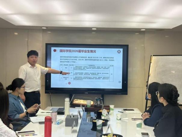 回雁雁院长向安植控股集团相关领导系统介绍了国际学院的办学特色、专业设置及人才培养优势,阐述了学院办学理念与人才培养目标。学工负责人吴锦涛详细介绍了学院2026届毕业生的总体情况、专业分布及人数。安植控股集团股份有限公司人力资源部经理康晓霞全面介绍了2026年及未来的人才招聘计划、岗位能力要求、核心需求方向与职业发展路径,明确指出企业亟需兼具国际视野、专业素养、跨文化沟通能力及实践操作能力的复合型人才。