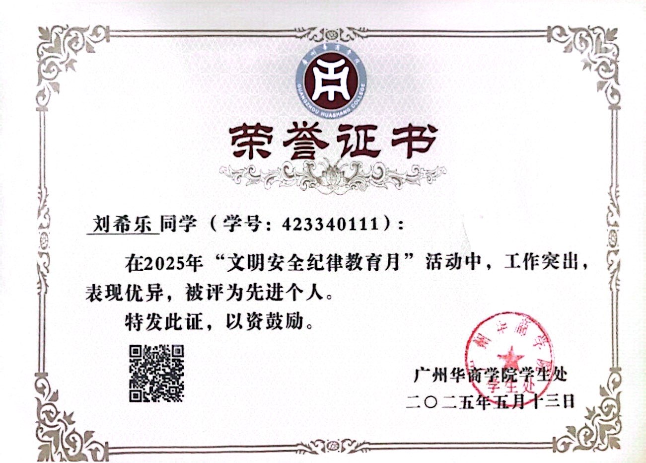 刘希乐,共青团员,曾担任2023-2024学年担任校青年志愿者协会社会志愿服务部工作人员、2023-2024学年校园通讯社暨易班工作总站行政监管部门工作人员、2024-2025学年担任国际学院青协分会负责人;现担任国际学院学生会主席团成员,班级学习委员。