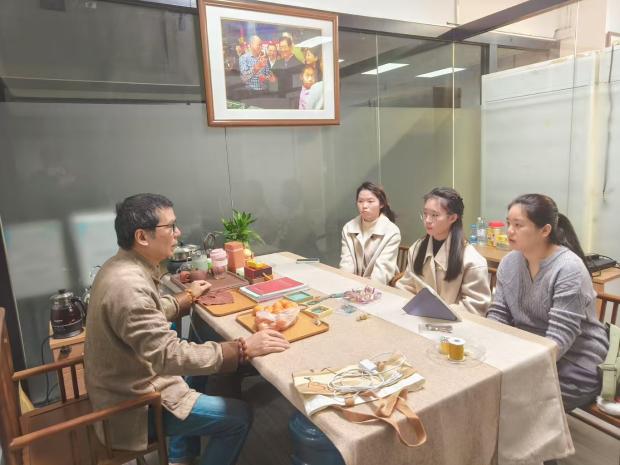 图2、图3榄韵未来探索队于广州市黄埔区励弘文创旗舰园与非遗文化传承人梁老师交谈