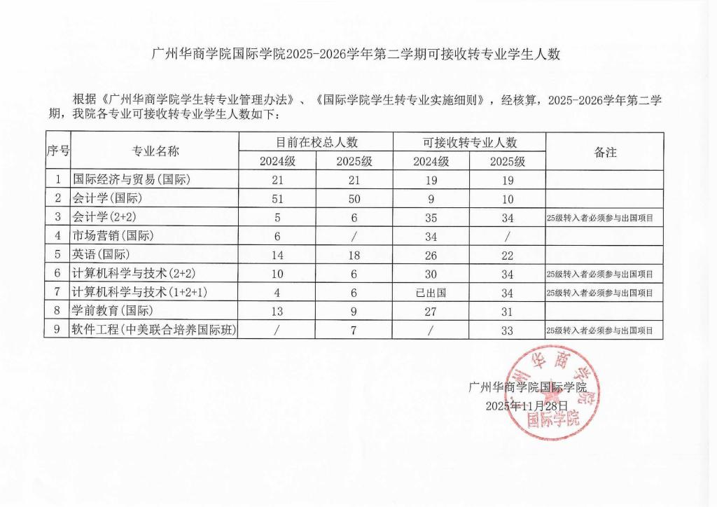 发布|国际学院2025-2026第二学年第二学期可接收转专业学生人数