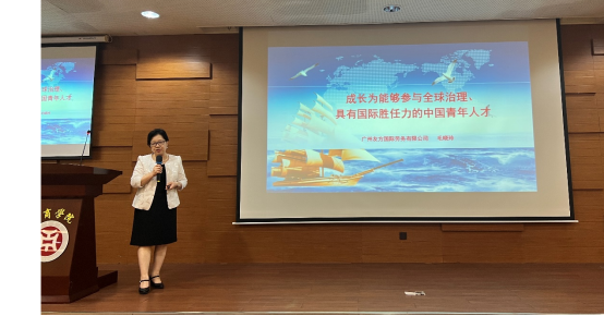 随后,毛晓玲总经理还从就业层面提升到大学生未来成长为具有国际胜任力、全球治理能力的人才高度。她讲到,到国际化企业就业只是初始阶段,是为大学生走向世界打下良好基础的阶段,随着我国国际地位的不断提升,联合国等国际组织也需要大量的中国籍职员,如果有机会进入这些领域,就具备了参与了国际事务和全球治理的能力,那将是更广阔的天地。