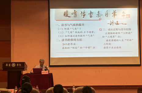 林伦伦教授首先从科学的角度讲解了什么叫“气质”以及气质对个人魅力和影响力养成的重要性;他通过分享国学大师饶宗颐先生、核潜艇之父黄旭华先生、杨叔子院士、数学家王梓坤院士的卓越贡献和气质,跟大学生们共同探究了气质形成的五要素:思想品质、人文素质、个人特质、性格素质和心理素质,并分别用案例说明了这五个要素之间的关系;随后,林伦伦教授指出,读书对于气质提升非常有益,不仅能够拓宽视野,丰富知识储备,更能滋养心灵,提升精神境界,读书会潜移默化、润物无声地改变着每一个人;最后,林伦伦教授向大学生们分享了常用的5+1读书法,即应用性读书法、休闲读书法、偏好读书法、经典读书法、研究读书法以及行路读书法—实践性学习,只有掌握了正确的阅读方法,才能够不断提升自己的知识水平和内在修养,也能培养出自身独特的气质。