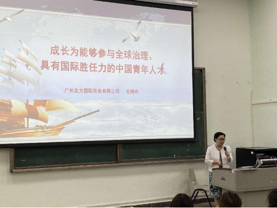 为了进一步拓宽大学生国际视野,让华商国际学院学子具备全球就业能力,广州华商学院国际学院特邀广州友方国际劳务有限公司毛晓玲总经理,于9月10日主讲了“成长为能够参与全球治理、具有国际胜任力的中国青年人才”的主题报告。广州华商学院国际学院院长回雁雁、直属党支部书记杨李军,国际学院2024级普高新生以及来自教师教育学院、健康医学院、传播与传媒学院、外国语学院的20多位大学生参加了报告会。国际学院直属党支部书记杨李军主持了报告会。