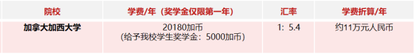 2)留学期间加方院校费用:按加方大学当年官网公布费用标准收费(2023年收费约人民币11万/学年,仅做参考)。项目内我校学生可获得加方院校入学奖学金约5000加币,学费折合为人民币7.9万/学年。