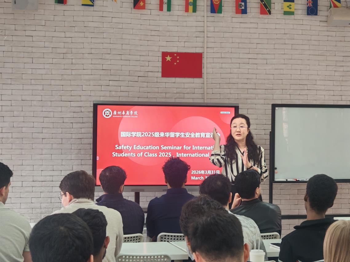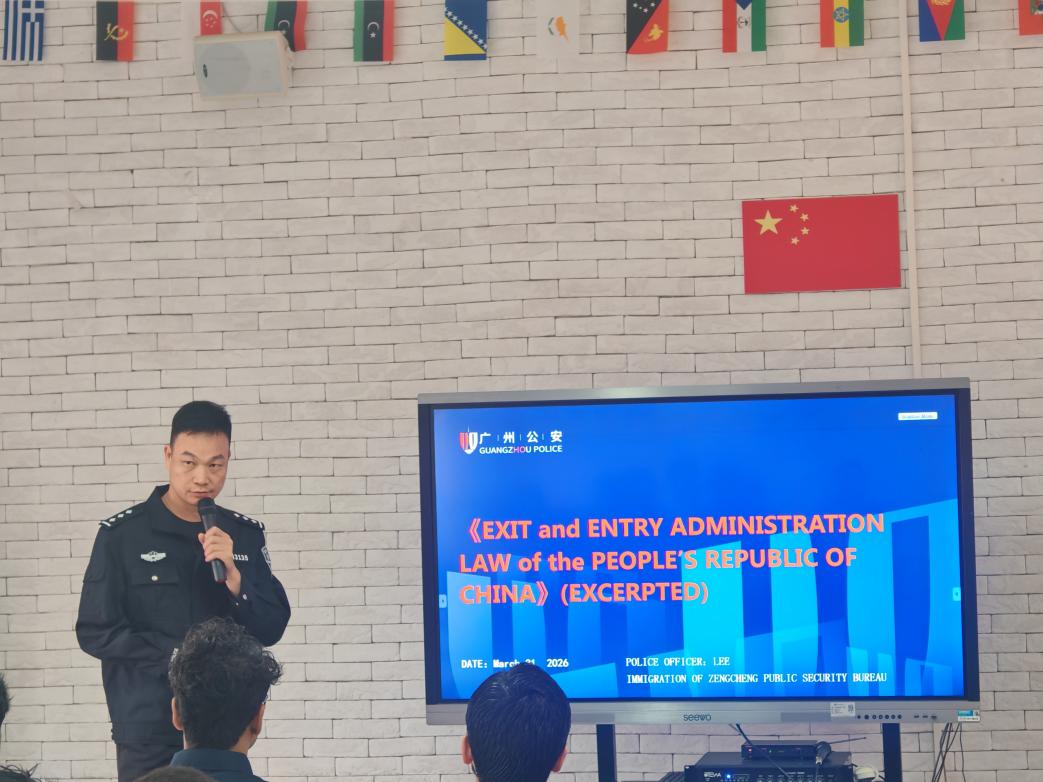 为了让来华留学生全面、深入地了解中国法律法规,增强安全防范意识,同时提升国际学院来华留学生管理队伍的涉外服务与管理能力,2026年3月31日,国际学院举办了安全教育宣讲会。增城公安分局人口大队李泽成副大队长、黎扬力警官,荔湖派出所黄晓江教导员、刘齐心副所长、裴先军警官,国际学院回雁雁院长、俞蓓副院长,后勤保卫处梁艳副处长,来华留学生辅导员郝自秀老师,来华留学生管理办公室全体工作人员,以及来自13个国家的26名来华留学生共同参加了此次宣讲会。